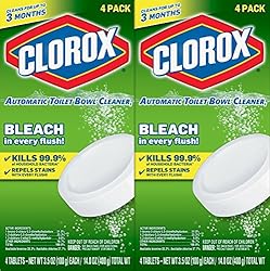 Clorox Automatic Toilet Bowl Cleaner tablet cleans and deodorizes with the power of bleach and kills 99.9% of household bacteria in the toilet bowl water. Each tablet sanitizes the toilet bowl water in 5 minutes, cleans for up to 3 months and helps prevent tough hard water, mineral and lime scale stains. These easy to use tablets keep your toilet smelling fresh and sparkling clean with every flush, leaving bowl water crystal clear. To sanitize, clean and deodorize, simply drop a tablet in the toilet tank and let it do its work. The tablet does not harm the septic tank. With Clorox, you know your toilet bowl is clean and disinfected.